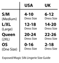 From the Exposed by Magic Silk collection, this style includes a basque featuring corset-style hook and eye closures in the front, a waist strap with swan hook closure in the back, attached garters, and a matching strappy panty. Black licorice indulgence meets slick and slippery wet-look fabric. Hand wash cold. No bleach. Dry flat.