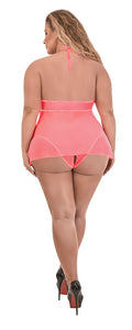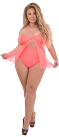 Exposed Forever Sheer Mesh Crotchless Teddy Coral Queen M245