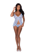 From the Exposed by Magic Silk collection, this style includes: a flowy lace baby doll featuring an open fly-away front, elastic adjustable shoulder straps with sliders, satin periwinkle bow details, and a matching lace thong with a split crotch.