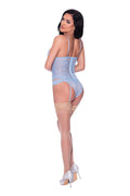 From the Exposed by Magic Silk collection, this style includes: a corset-style bustier featuring hook & eye closures along the back, elastic adjustable shoulder straps with sliders, a satin periwinkle bow detail, attached adjustable garter straps with sliders, and a matching lace G-string.