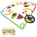 Players stand on their chosen coloured footprints wearing their matching coloured glasses. Players take it in turns to spin. That player then has to do what the arrow lands on, for instance, hand on red bum, left foot on banana, etc. If a player lands on Fondle they have to do a forfeit.